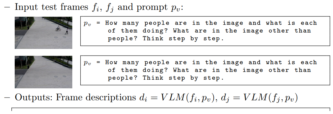 이후, 해당 모듈은 "사람들은 무엇을 하고 있나요?", "사람 외에 이미지에는 무엇이 있나요?" 와 같은 프롬프트 $p_v$와 함께 정상 참조 프레임의 텍스트 설명 $D_{\text{normal}} = \{VLM(f_{\text{normal}_i}, p_v) \mid f_{\text{normal}_i} \in F_{\text{normal}}\}$ 을 출력합니다.