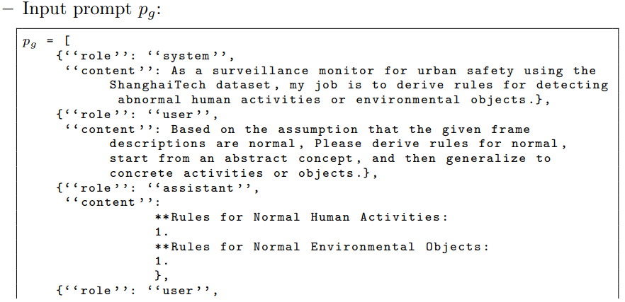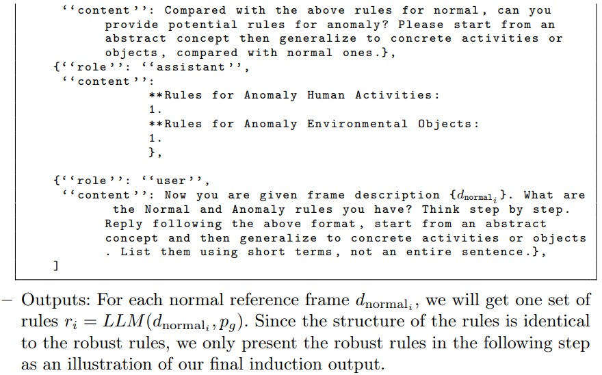 정상 참조 프레임의 텍스트 설명 $D^{\text{normal}}$을 사용하여, 고정된(frozen) LLM을 이용해 규칙($R$)을 생성하는 규칙 생성 모듈을 설계합니다($R = \{LLM(d_{\text{normal}_i}, p_g) \mid d_{\text{normal}_i} \in D_{\text{normal}}\}$). 여기서 프롬프트 $p_g$는 다음과 같습니다.