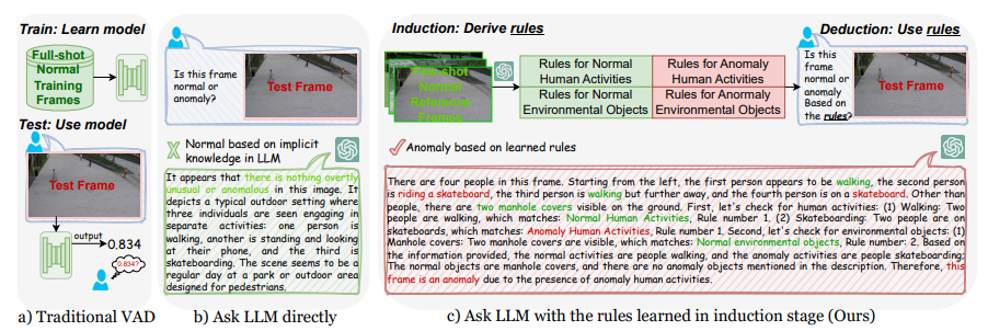 위 이미지를 보면 기존 VAD 방법론(a)과 LLM에 직접적으로 질문하여 이상 여부를 도출(b)하는 것과 비교했을 때, 본 논문에서 제안한 AnomalyRuler(c)의 차이를 확인할 수 있습니다.